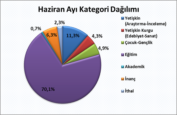 2018 yılı Haziran ayında yayıncılarımızın almış olduğu bandrollerin, kategori dağılımına göre yayımlanan kitapların %11,3'ünü yetişkin inceleme araştırma kitapları, %4,3'ünü yetişkin edebiyat sanat kitapları, yaklaşık %4,9'unu çocuk ve gençlik kitapları, %6,3'ünü inanç kitapları, %0,7'sini akademik yayınlar, %70'ini eğitim alanındaki kitaplar ve %2,3’ünü ithal kitaplar oluşturdu.