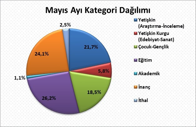 2018 yılı Mayıs ayında yayıncılarımızın almış olduğu bandrollerin, kategori dağılımına göre yayımlanan kitapların %21,7'sini yetişkin inceleme araştırma kitapları, yaklaşık %6'sını yetişkin edebiyat sanat kitapları, yaklaşık %19'unu çocuk ve gençlik kitapları, %24'ünü inanç kitapları, %1'ini akademik yayınlar, yaklaşık %26'sını eğitim alanındaki kitaplar ve %2,5’ini ithal kitaplar oluşturdu.