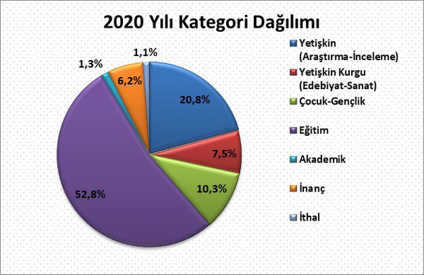 2020 yılında yayımlanan kitapların %20,8'sini yetişkin araştırma, inceleme kitapları, %7,5'ini yetişkin edebiyat sanat kitapları, %10,3'ünü çocuk ve gençlik kitapları, %6,2'sini inanç kitapları, yaklaşık %1,3’ünü akademik yayınlar, yine yaklaşık %1,1’ini ithal yayınlar kitapları ve %52,8'ini eğitim alanındaki kitaplar oluşturdu. Aşağıdaki tabloda da detaylandırdığımız son duruma göre yetişkin araştırma-inceleme, yetişkin kurgu, akademik yayınlar kategorisinde büyüme gözlenirken, inanç ve ithal kategoride yayımlanan kitaplar düşüş kaydetmiştir.