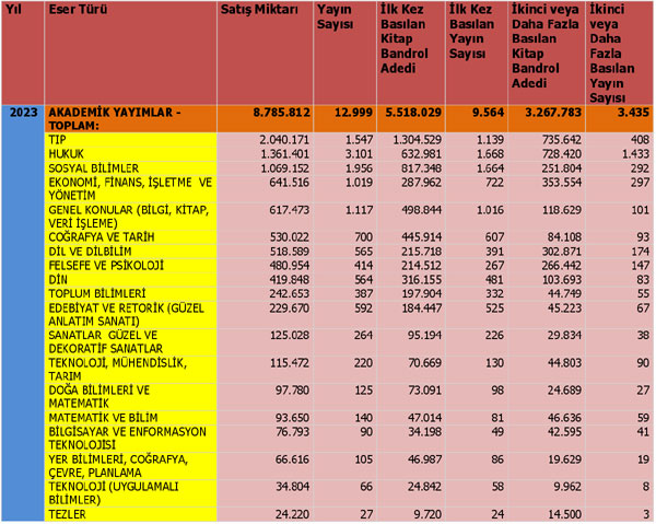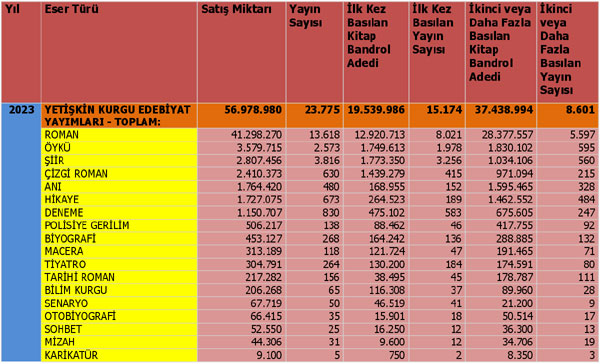 Yayımcılık sektörü 2022 yılını 380.296.402 adet kitap üretimi ile tamamlamıştı. 2023 yılını ise 400.340.577 adet ile tamamladı. 2023 yılında bir önceki yıla göre 20 milyon adet, oransal olarak %5,3 büyüme gerçekleşti. Geçen yıl yaşanan küçülme sürecinden sonra tekrar kitap üretiminde büyüme gerçekleşmiş oldu. Sektörümüzün kitap üretim adetleri ilk kez 2016 yılında 400 milyon bandını aşmıştı. Sonrasında 2021 yılında en yüksek seviye olan 439 milyon sınırına ulaşmıştı. Geçen yıl yaşanan gerilemeden sonra tekrar yükseliş yönünde eğilim başlamış oldu.