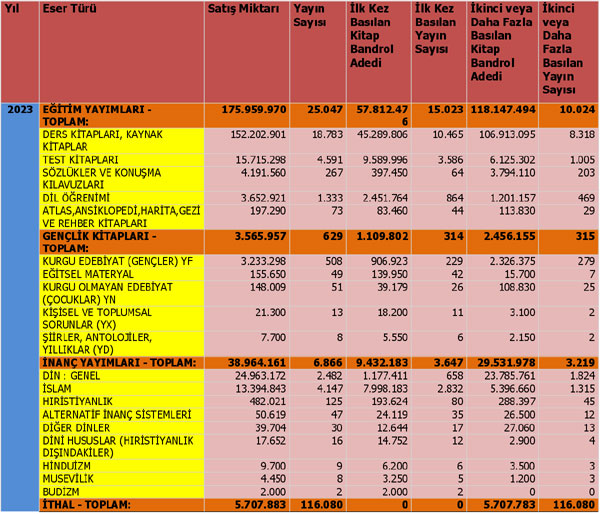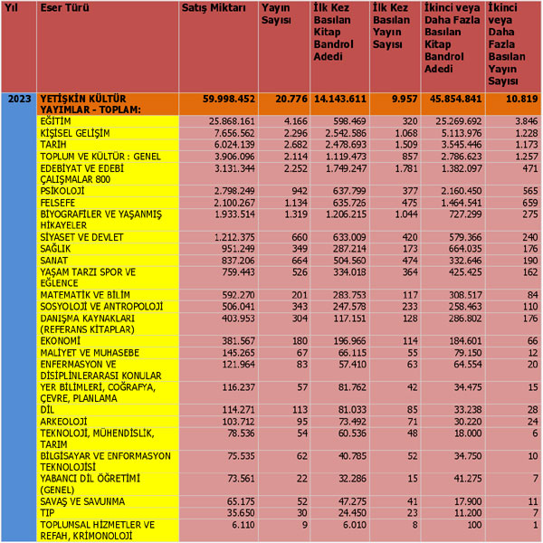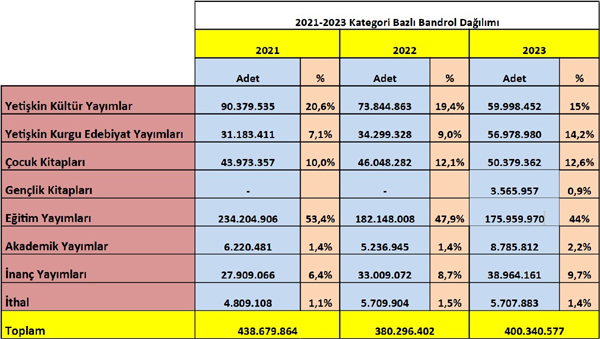 2023 yılından itibaren kategori başlıkları THGM sisteminde yenilenmiştir. Bizde bu yıldan itibaren raporlamalarımızı yeni başlıkları dikkate alarak düzenledik. 2023 yılında %15’ini Yetişkin Kültür Yayımları, %14,2’sini Yetişkin Kurgu Edebiyat Yayımları, %12,6'sını Çocuk Kitapları, %0,9'unu Gençlik Kitapları, %9,7'sini İnanç Yayımları, %2,2'sini Akademik Yayımlar, %1,4’ünü İthal kitaplar ve %44'ünü Eğitim Yayımları oluşturdu.