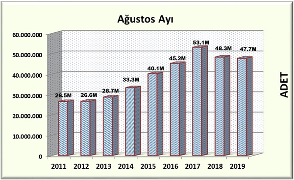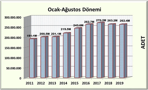 Ağustos ayı ile yılın ilk sekiz ayını tamamlamış oldu. Yılın ilk sekiz ayında 262.391.074 adet kitap üretilmiştir. Geçen yılın aynı döneminde ise adet 263.197.500 olarak gerçekleşmişti. Geçen yıl ile karşılaştırdığımızda ilk sekiz ay sonunda üretilen kitap adedinde yaklaşık 800 bin adet ve %0,3 oranında bir düşüş gözlenmektedir.
