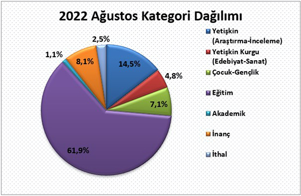 2022 yılı Ağustos ayında yayıncılarımızın almış olduğu bandrollerin kategori dağılımına göre; yayımlanan kitapların %14,5’ini yetişkin inceleme araştırma kitapları, %4,8’ini yetişkin edebiyat sanat kitapları, %7,1'ini çocuk ve gençlik kitapları, %8,1’ini inanç kitapları, %1,1'ini akademik yayınlar, %61,9'unu eğitim alanındaki kitaplar ve %2,5’ini ithal kitaplar oluşturdu.
