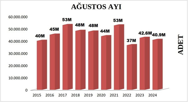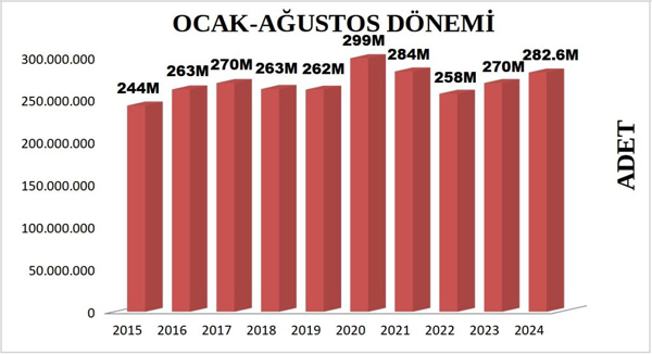 Yılın ilk sekiz ayı dikkate alındığında ise; 2023 yılında gerçekleşen kitap üretim adedi 270.259.470 iken, 2024 yılındaki üretim 282.619.278 adet olarak gerçekleşmiştir. Geçen yılın ilk sekiz ayı ile kıyaslandığında bu yıl Ocak-Ağustos dönemi kitap üretiminde %4,5 oranında büyüme gerçekleşmiştir.