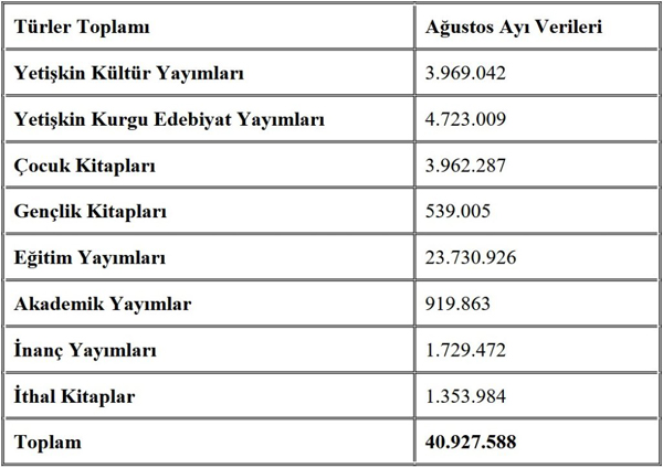 Kurucu üyesi olduğumuz Yayımcı Meslek Birlikleri Federasyonu (YAYFED) verilerine göre; 2024 yılının Ağustos ayında yayıncılarımız 40.927.588 adet kitap üretimi gerçekleştirdi.