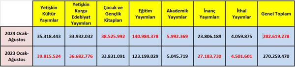Aşağıdaki kategorik tabloya baktığımızda ise; 2024 yılı Ocak-Ağustos dönemi Yetişkin Kültür Yayımları, geçen yılın aynı dönemine göre yaklaşık %12 oranında, Yetişkin Kurgu Edebiyat Yayımları da yaklaşık %9 oranında gerilemiştir. Buna karşılık, geçen yılın aynı dönemine göre bu yıl Eğitim Yayımları %14, Akademik Yayımlar %18, Çocuk ve Gençlik Kitapları da %14 oranında artış kaydetmiştir. İnanç Yayımları kategorisinde de bir önceki yıla göre yaklaşık %14 oranında gerileme gözlenmiştir.