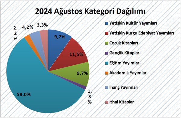 2024 yılı Ağustos ayında yayımcılarımızın almış olduğu bandrollerin kategori dağılımına göre yayımlanan kitapların yaklaşık %9,7’sini Yetişkin Kültür Yayımları, %11,5’ini Yetişkin Kurgu Edebiyat Yayımları, %9,7’sini Çocuk Kitapları, %1,3’ünü Gençlik Kitapları, %4,2'sini İnanç Yayımları, %2,2’sini Akademik Yayımlar, %3,3’ünü İthal kitaplar ve %58’ini Eğitim Yayımları oluşturdu.