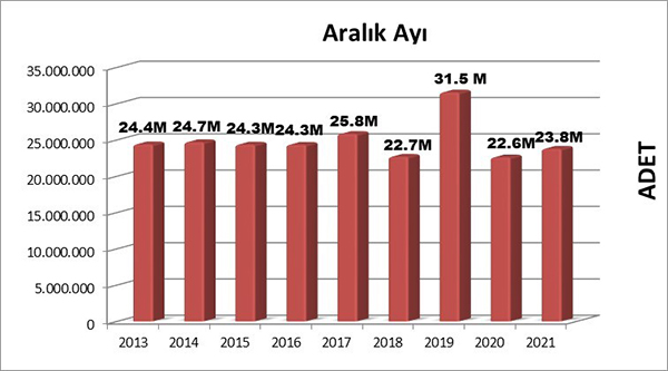 2021 Aralık ayında 23.819.636 adet kitap üretimi gerçekleşmiştir. Geçen yılın aynı ayında 22.627.607 adet kitap üretimi gerçekleşmiş olup oransal olarak yaklaşık %5 bir büyüme olduğu gözlenmektedir.