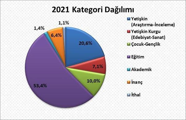2021 yılında yayımlanan kitapların %20,6'sini yetişkin araştırma, inceleme kitapları, %7,1'ini yetişkin edebiyat sanat kitapları, %10'unu çocuk ve gençlik kitapları, %6,4'ünü inanç kitapları, yaklaşık %1,4’ünü akademik yayınlar, yaklaşık %1,1’ini ithal yayınlar kitapları ve %53,4'ünü eğitim alanındaki kitaplar oluşturdu.