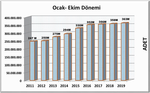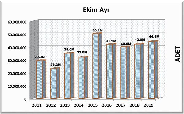 YAYFED verilerine göre; yayıncıların geçen yılın Ekim ayındaki bandrol talebi 42.085.636 adet olarak kayıtlara geçerken 2019 Ekim ayında 44.155.154 adet olarak gerçekleşmiştir. Bu rakamlar doğrultusunda 2019 Ekim ayında bir önceki yılın aynı ayına göre yaklaşık %5 oranında bir büyüme gerçekleşmiştir.