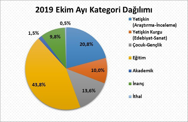 2019 yılı Ekim ayında yayıncılarımızın almış olduğu bandrollerin kategori dağılımına göre yayınlanan kitapların %20,8’ini yetişkin inceleme, araştırma kitapları, %10’unu yetişkin edebiyat sanat kitapları, yaklaşık %13,6'sını çocuk ve gençlik kitapları, %9,8'ini inanç kitapları, %1,5'ini akademik yayınlar, %43,8'ini eğitim alanındaki kitaplar ve yaklaşık %0,5’ini ithal kitaplar oluşturdu.