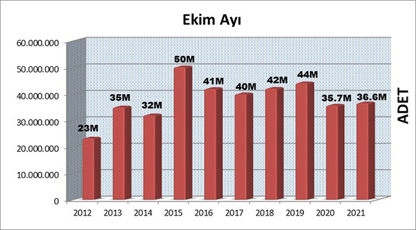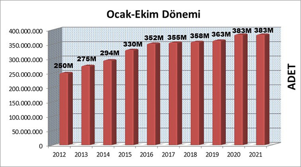 Ekim ayı ile yılın ilk on ayını tamamlanmış oldu. 2021 yılının ilk on ayında yayımlanan toplam kitap sayısı 383.643.235 adet olarak gerçekleşirken önceki yılın aynı döneminde ise yayımlanan kitap sayısı 383.720.240 adettir. Bu rakamlar dikkate alındığında son iki yılın ilk on aylık kitap üretiminin yaklaşık eşit olduğu söylenebilir.