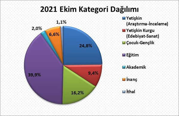 2021 yılı Ekim ayında yayıncılarımızın almış olduğu bandrollerin kategori dağılımına göre, yayımlanan kitapların %24,8’ini yetişkin inceleme araştırma kitapları, %9,4’ünü yetişkin edebiyat sanat kitapları, yaklaşık %16,2'sini çocuk ve gençlik kitapları, yaklaşık %6,6’sını inanç kitapları, %2'sini akademik yayınlar, %39,9’ini eğitim alanındaki kitaplar ve yaklaşık %1,1’ini ithal kitaplar oluşturdu.