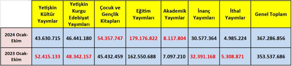 Kategorik tabloya baktığımızda ise; 2024 yılı Ocak-Ekim dönemi Yetişkin Kültür Yayımları, geçen yılın aynı dönemine göre yaklaşık %20 oranında, Yetişkin Kurgu Edebiyat Yayımları da yaklaşık %5 oranında gerilemiştir. Buna karşılık, geçen yılın aynı dönemine göre bu yıl Eğitim Yayımları %10.5, Akademik Yayımlar %13, Çocuk ve Gençlik Kitapları da %20 oranında artış kaydetmiştir. İnanç Yayımları kategorisinde de bir önceki yıla göre yaklaşık %7 oranında gerileme gözlenmiştir.