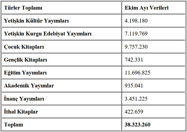 Kurucu üyesi olduğumuz Yayımcı Meslek Birlikleri Federasyonu (YAYFED) verilerine göre; 2024 yılının Ekim ayında yayıncılarımız 38.323.260 adet kitap üretimi gerçekleştirdi.