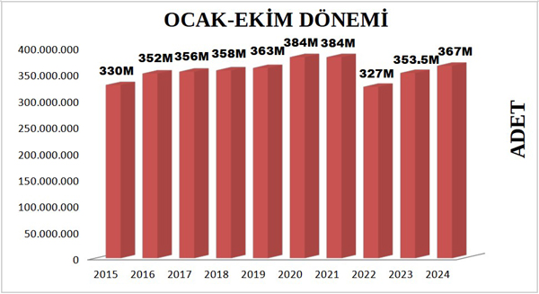 Yılın ilk on ayı dikkate alındığında ise; 2023 yılında gerçekleşen kitap üretim dedi 353.537.686 iken, 2024 yılındaki üretim 367.286.856 adet olarak gerçekleşmiştir. Geçen yılın ilk on ayı ile kıyaslandığında bu yıl Ocak-Ekim dönemi kitap üretiminde %4 oranında büyüme gerçekleşmiştir.