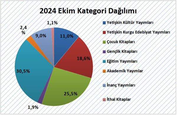 2024 yılı Ekim ayında yayımcılarımızın almış olduğu bandrollerin kategori dağılımına göre yayımlanan kitapların yaklaşık %11’ini Yetişkin Kültür Yayımları, %18,6’sını Yetişkin Kurgu Edebiyat Yayımları, %25,5’ini Çocuk Kitapları, %1,9’unu Gençlik Kitapları, %9’’unu İnanç Yayımları, %2,4’ünü Akademik Yayımlar, %1,1’ini İthal kitaplar ve %30,5’ini Eğitim Yayımları oluşturdu.