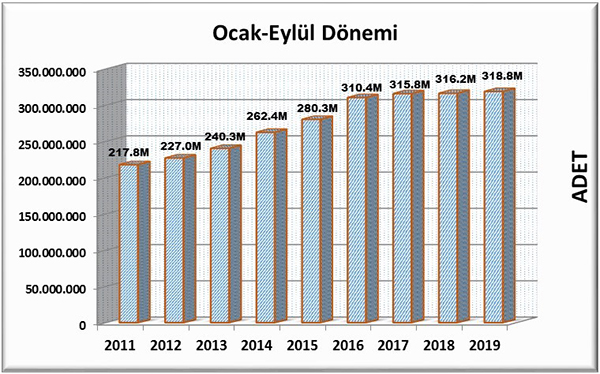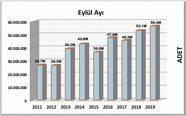 2019 Eylül ayında yayıncılarımızın bandrol talebi 56.458.626 adet olarak gerçekleşmiştir. Geçen yılın aynı ayında gerçekleşen bandrol talebi 53.063.735 adet olarak kayıtlara geçerken kitap üretimi 2019 Eylül ayında bir önceki yıla oranla %6,4 oranında bir büyüme gerçekleştiği gözlenmiştir.
