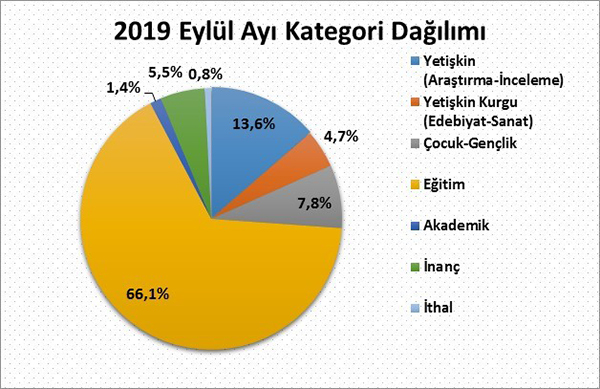 2019 yılı eylül ayında yayıncılarımızın almış olduğu bandrollerin kategori dağılımına göre yayınlanan kitapların %13,6’sını yetişkin inceleme, araştırma kitapları, %4,7’sini yetişkin edebiyat sanat kitapları, yaklaşık %7,8'ini çocuk ve gençlik kitapları, %5,5'ini inanç kitapları, %1,4'ünü akademik yayınlar, %66,1'ini eğitim alanındaki kitaplar ve yaklaşık %0,8’ini ithal kitaplar oluşturdu.