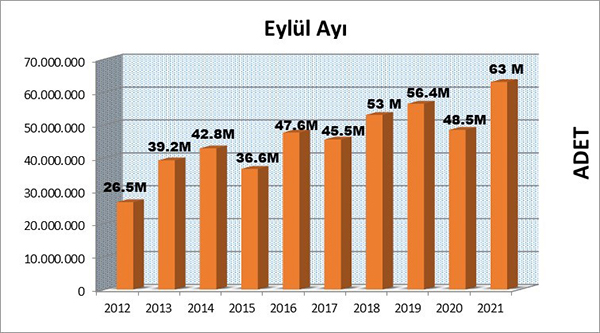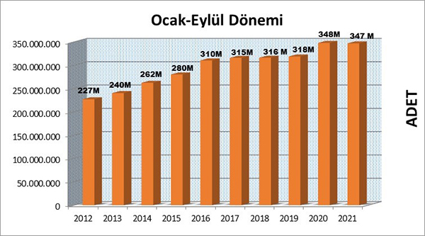 Eylül ayı ile yılın ilk üç çeyreğini tamamlamış olduk. 2020 yılının üç çeyreğinde yayımlanan toplam kitap sayısı 348.018.305 adet olarak gerçekleşmişti. Bu yılın aynı döneminde ise yayımlanan kitap sayısı 347.042.065 adettir. Bu rakamlara göre yılın ilk dokuz ayında, geçen yılın aynı dönemine oranla kitap üretimi yaklaşık aynı seviyede gerçekleşmiştir. Yılın son çeyreğinde bir önceki yıla göre yayımlanan kitap adedinin artacağını ve 2021 yılını yeni bir büyüme yılı olarak tamamlayacağımızı düşünmekteyiz.