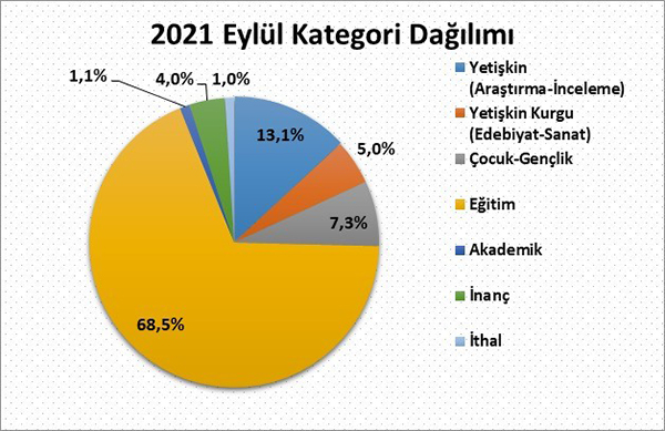 2021 yılı Eylül ayında yayıncılarımızın almış olduğu bandrollerin kategori dağılımına göre yayımlanan kitapların %13,1’ini yetişkin inceleme araştırma kitapları, yaklaşık %5’ini yetişkin edebiyat sanat kitapları, yaklaşık %7,3'ünü çocuk ve gençlik kitapları, %4’ünü inanç kitapları, %1,1'ini akademik yayınlar, yaklaşık %68,5’ini eğitim alanındaki kitaplar ve yaklaşık %1’ini ithal kitaplar oluşturdu.
