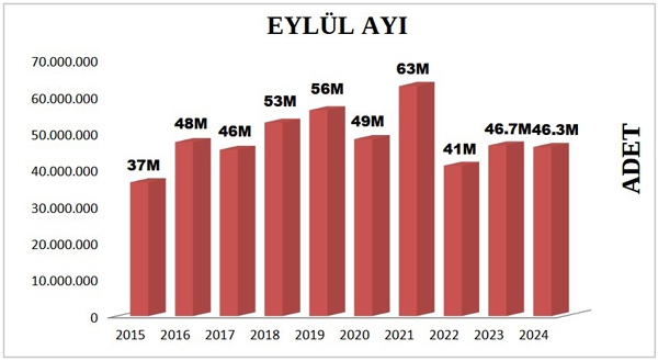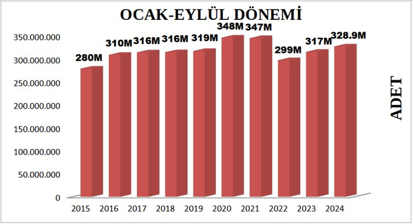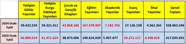 Yılın ilk dokuz ayı dikkate alındığında ise; 2023 yılında gerçekleşen kitap üretim adedi 317.035.691 iken, 2024 yılındaki üretim 328.963.596 adet olarak gerçekleşmiştir. Geçen yılın ilk dokuz ayı ile kıyaslandığında bu yıl Ocak-Eylül dönemi kitap üretiminde %4 oranında büyüme gerçekleşmiştir.