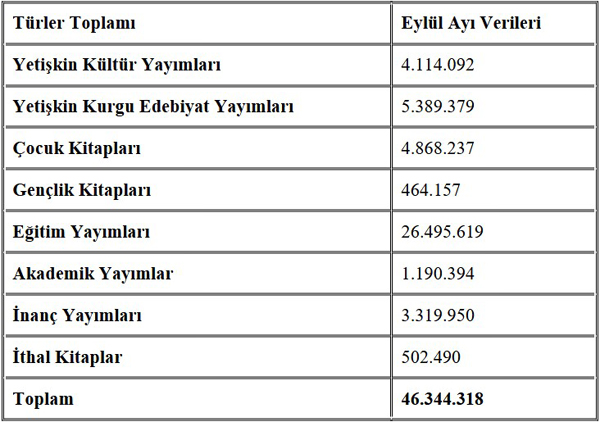 Kurucu üyesi olduğumuz Yayımcı Meslek Birlikleri Federasyonu (YAYFED) verilerine göre; 2024 yılının Eylül ayında yayıncılarımız 46.344.318 adet kitap üretimi gerçekleştirdi.