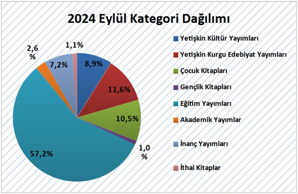 2024 yılı Eylül ayında yayımcılarımızın almış olduğu bandrollerin kategori dağılımına göre yayımlanan kitapların yaklaşık %8,9’unu Yetişkin Kültür Yayımları, %11,6’sını Yetişkin Kurgu Edebiyat Yayımları, %10,5’ini Çocuk Kitapları, %1’ini Gençlik Kitapları, %7,2’sini İnanç Yayımları, %2,6’sını Akademik Yayımlar, %1,1’ini İthal kitaplar ve %57,2’sini Eğitim Yayımları oluşturdu.