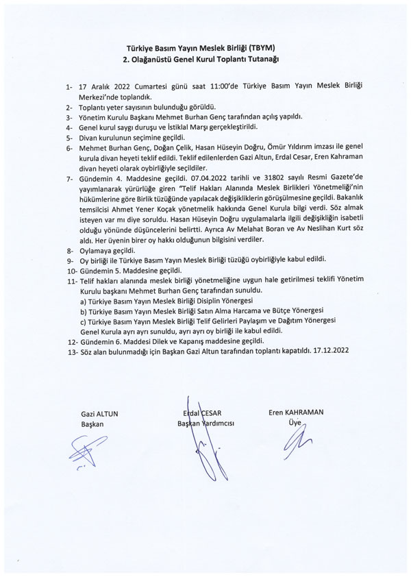 07/04/2022 tarihli ve 31802 sayılı Resmi Gazete’de yayımlanarak yürürlüğe giren “Telif Hakları Alanında Meslek Birlikleri Yönetmeliği” Geçici madde 1 hükmüne göre meslek birlikleri en geç 1/1/2023 tarihinde kadar olağanüstü genel kurul toplantısı yapmaları gerekmektedir. Bu olağanüstü genel kurul toplantısında, tüzüklerini ve birliğin işleyişine dair diğer düzenlemeleri bu Yönetmelik hükümlerine uygun hale getirmeleri gerekmektedir. Toplantıda gündeme başka madde eklenemeyeceği hükmü amirdir.