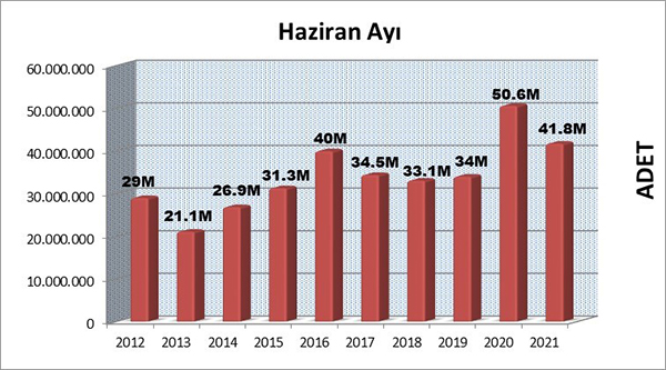 YAYFED verilerine göre; 2021 yılının Haziran ayında yayıncılar, 41.798.817 adet kitap üretimi gerçekleştirdi. 2020 yılının aynı ayındaki adet 50.665.889 olarak kayıtlara geçmişti. Geçen yıla oranla %18 oranında bir düşüş görülmektedir. Haziran ayındaki kitap üretim adedi federasyonumuz tarafından kayıtların tutulduğu dönem içerisindeki en yüksek ikinci rakam olsa da, bu durum geçen yıla oranla on milyon adet üzerinde bir düşüş yaşandığı gerçeğini değiştirmez.