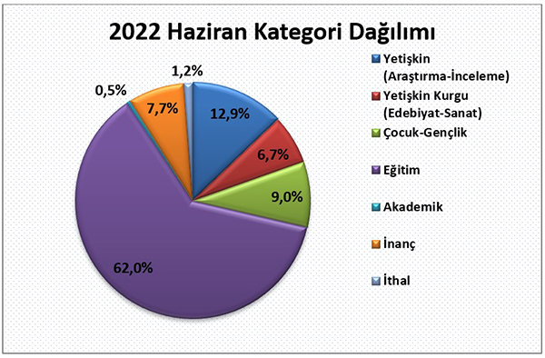 2022 yılı Haziran ayında yayıncılarımızın almış olduğu bandrollerin kategori dağılımına göre; yayımlanan kitapların %12,9’unu yetişkin inceleme araştırma kitapları, %6,7’sini yetişkin edebiyat sanat kitapları, %9'unu çocuk ve gençlik kitapları, %7,7’sini inanç kitapları, %0,5'ini akademik yayınlar, %62'sini eğitim alanındaki kitaplar ve %1,2’sini ithal kitaplar oluşturdu.