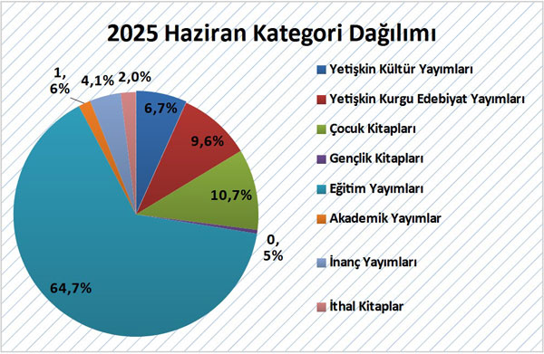 2025 yılı Haziran ayında yayımcılarımızın almış olduğu bandrollerin kategori dağılımına göre; yayımlanan kitapların yaklaşık %6,7’sini Yetişkin Kültür Yayımları, %9,6’sını Yetişkin Kurgu Edebiyat Yayımları, %10,7’sini Çocuk Kitapları, %0,5’ini Gençlik Kitapları, %4,1’ini İnanç Yayımları, %1,6’sını Akademik Yayımlar, %2’sini İthal kitaplar ve %64,7’sini Eğitim Yayımları oluşturdu.