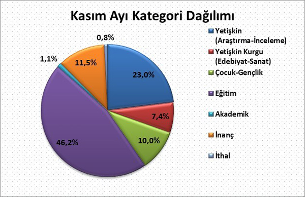 2018 yılı Kasım ayında yayıncılarımızın almış olduğu bandrollerin, kategori dağılımına göre yayımlanan kitapların %23'ünü yetişkin inceleme araştırma kitapları, %7,4'ünü yetişkin edebiyat sanat kitapları, %10'unu çocuk ve gençlik kitapları, %11,5’ini inanç kitapları, %1,1'ini akademik yayınlar, %46,2'sini eğitim alanındaki kitaplar ve %0,8’ini ithal kategorisindeki kitaplar oluşturdu.
