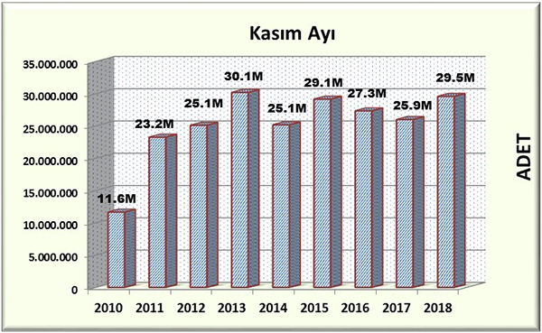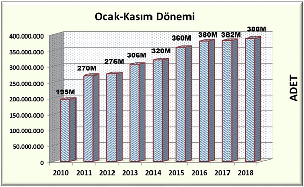 Kasım ayı ile birlikte yılın ilk on bir ayını tamamlamış olduk. Bu yılın ilk on bir ayında bandrol talebi 387.926.675 adet olarak gerçekleşti. Geçen yılın aynı dönemindeki talep 381.881.249 adet olarak gerçekleşmişti. 2018 yılı ile 2017 yılının ilk on bir aylarındaki bandrol talebi karşılaştırıldığında yaklaşık %1,6 oranında büyümenin gerçekleştiğini görmekteyiz. Eğitim Yayınları kategorisinde Ağustos ayından itibaren başlayan pozitif artış Kasım ayında da kendini göstermiş olup 2017 yılı Kasım ayına göre dört milyon adetin üzerinde daha fazla kitap üretimi gerçekleşmiştir. Yılın ilk on bir aylarını karşılaştırarak baktığımızda bu kategoride geçen yıla göre yedi milyon adet daha fazla kitap üretiminin oluştuğunu gözlemlemekteyiz. İnanç Kategorisinde yayınlanan kitap adetinin bir önceki yılın aynı dönemine göre üç milyon adet civarında bir artış ile on bir ay sonunda ortaya çıkan pozitif tabloyu desteklediğini görmekteyiz. Diğer dört kategoride ise geçen yıla oranla bandrol talebinde azalma olduğu görülmektedir. Bütün bu değerlendirmeler neticesinde; sektörümüzü etkileyen birçok olumsuzluğa rağmen sektörümüz on bir ayın sonunda kitap üretiminde bir önceki yıla göre büyüme kaydetmiştir.