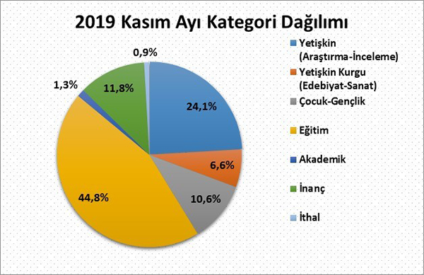 2019 yılı Kasım ayında yayıncıların almış olduğu bandrollerin kategori dağılımına göre yayımlanan kitapların %24,1’ini yetişkin inceleme araştırma kitapları, %6,6’sını yetişkin edebiyat sanat kitapları, yaklaşık %10,6'sını çocuk ve gençlik kitapları, %11,8'ini inanç kitapları, %1,3'ünü akademik yayınlar, %44,8'ini eğitim alanındaki kitaplar ve yaklaşık %0,9’unu ithal kitaplar oluşturdu.