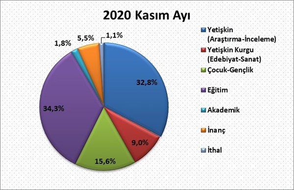 2020 yılı Kasım ayında alınan bandrollerin kategori dağılımına göre yayımlanan kitapların %32,8’ini yetişkin inceleme araştırma kitapları, yaklaşık %9’unu yetişkin edebiyat sanat kitapları, yaklaşık %15,6'sını çocuk ve gençlik kitapları, %5,5'ini inanç kitapları, %1,8'ini akademik yayınlar, yaklaşık %34,3'ünü eğitim alanındaki kitaplar ve yaklaşık %1,1’ini ithal kitaplar oluşturdu.