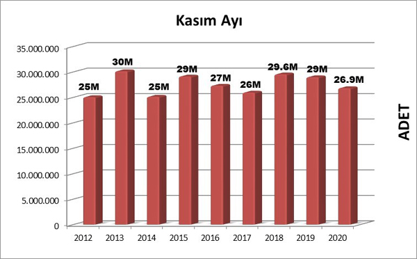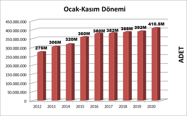 Kasım ayı ile yılın on bir ayını tamamlamış olduk. Yılın ilk on bir ayında üretilen kitap sayısı 410.586.025 adet olarak gerçekleşti. Geçen yılın aynı döneminde gerçekleşen adet 392.024.297 olarak kayıtlara geçmişti. Bu rakamlar doğrultusunda 2020 yılının ilk on bir ayında, geçen yılın aynı dönemine göre %4,7 oranının üzerinde büyümenin gerçekleştiğini görmekteyiz.