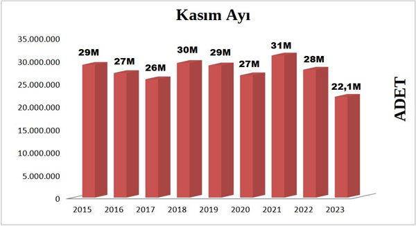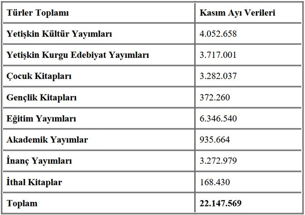 YAYFED verilerine göre; 2023 yılının Kasım ayında yayımcılarımız 22.147.569 adet kitap üretimi gerçekleştirdi. 2022 yılının aynı ayındaki rakam 28.104.646 olarak kayıtlara geçmişti. Geçen yıla oranla %21,2 oranında küçülme gerçekleşti.