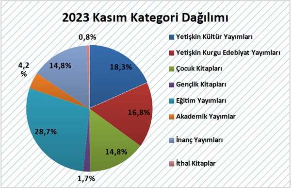 2023 yılı Kasım ayında yayıncılarımızın almış olduğu bandrollerin kategori dağılımına göre yayımlanan kitapların %18,3’ünü Yetişkin Kültür Yayımları, %16,8’ini Yetişkin Kurgu Edebiyat Yayımları, %14,8’ini Çocuk Kitapları, %1,7’sini Gençlik Kitapları, %14,8’ini İnanç Yayımları, %4,2’sini Akademik Yayımlar, %0,8’ini İthal kitaplar ve %28,7’sini Eğitim Yayımları oluşturdu.