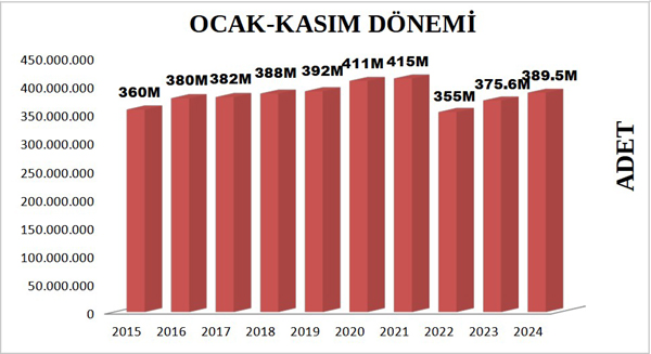 Yılın ilk on bir ayı dikkate alındığında ise; 2023 yılında gerçekleşen kitap üretim adedi 375.685.255 iken, 2024 yılındaki üretim 389.593.807 adet olarak gerçekleşmiştir. Geçen yılın ilk on bir ayı ile kıyaslandığında bu yıl Ocak-Kasım dönemi kitap üretiminde %4 oranında büyüme gerçekleşmiştir.