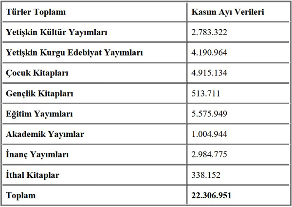 Kurucu üyesi olduğumuz Yayımcı Meslek Birlikleri Federasyonu (YAYFED) verilerine göre; 2024 yılının Kasım ayında yayıncılarımız 22.306.951 adet kitap üretimi gerçekleştirdi.