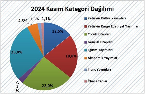 2024 yılı Kasım ayında yayımcılarımızın almış olduğu bandrollerin kategori dağılımına göre yayımlanan kitapların yaklaşık %12,5’ini Yetişkin Kültür Yayımları, %18,8’ini Yetişkin Kurgu Edebiyat Yayımları, %22’sini Çocuk Kitapları, %2,3’ünü Gençlik Kitapları, %13,4’’ünü İnanç Yayımları, %4,5’ini Akademik Yayımlar, %1,5’ini İthal kitaplar ve %25’ini Eğitim Yayımları oluşturdu.