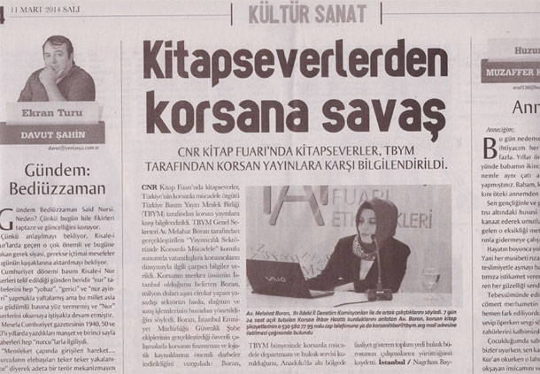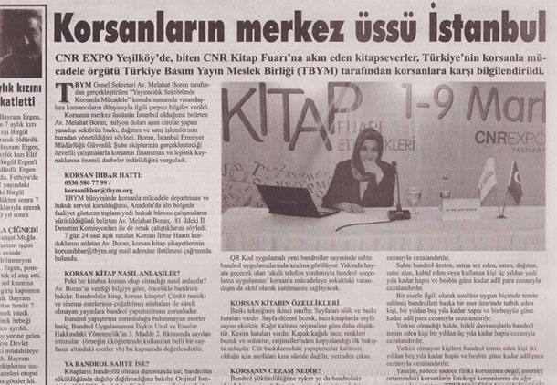 CNR EXPO Yeşilköy’de, 1 Mart 2014 tarihinde başlayan CNR Kitap Fuarı’na akın eden kitapseverler, Türkiye’nin korsanla mücadele örgütü Türkiye Basım Yayın Meslek Birliği (TBYM) tarafından korsanlara karşı bilgilendirildi. TBYM Genel Sekreteri Av. Melahat Boran tarafından gerçekleştirilen “Yayımcılık Sektöründe Korsanla Mücadele” konulu sunumda vatandaşlara korsancıların dünyasıyla ilgili çarpıcı bilgiler verildi.