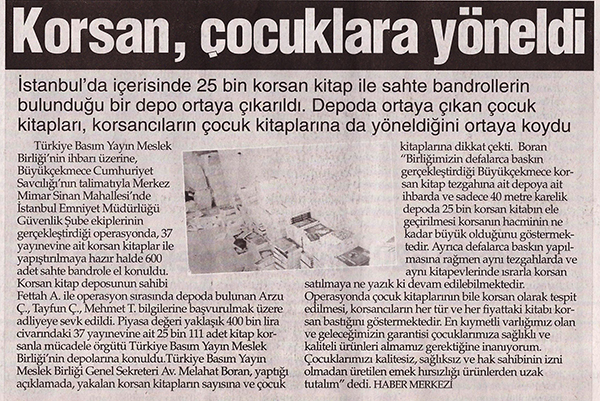 İstanbul'un korsan kitap tezgâhlarıyla ünlü ilçelerinden Büyükçekmece'de içerisinde 25 bin korsan kitap ile sahte bandrollerin bulunduğu depo ortaya çıkarıldı. Depoda ortaya çıkan çocuk kitapları, korsanın 100 temel eserden sonra çocuk kitaplarına da yöneldiğini ortaya çıkardı.