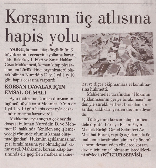 İstanbul Anadolu Fikri ve Sınai Haklar Ceza Mahkemesi’nin Şubat ayında, Türkiye'nin en büyük kitap korsanlarından Ali Y.’yi 1 yıl 8 ay hapis cezasına çarptırmasının ardından korsana iki büyük darbe daha vuruldu.