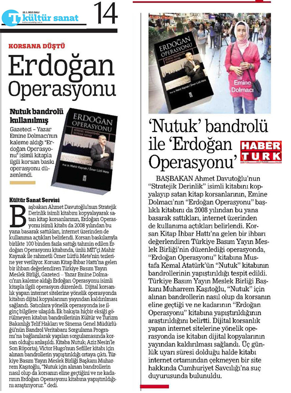 “Daha çok sahaflardan elde edilen kitapların bandrol kontrollerinde; Timaş Yayınları’nın bandrolünü taşıması gereken kitaba Mustafa Kemal Atatürk’ün yazarı olduğu Nutuk’un bandrollerinin yapıştırıldığını tespit ettik. Nutuk için alınan bandrollerin nasıl olup da korsanın eline geçtiğini ve ne kadarının Erdoğan Operasyonu kitabına yapıştırıldığını araştırıyoruz.
