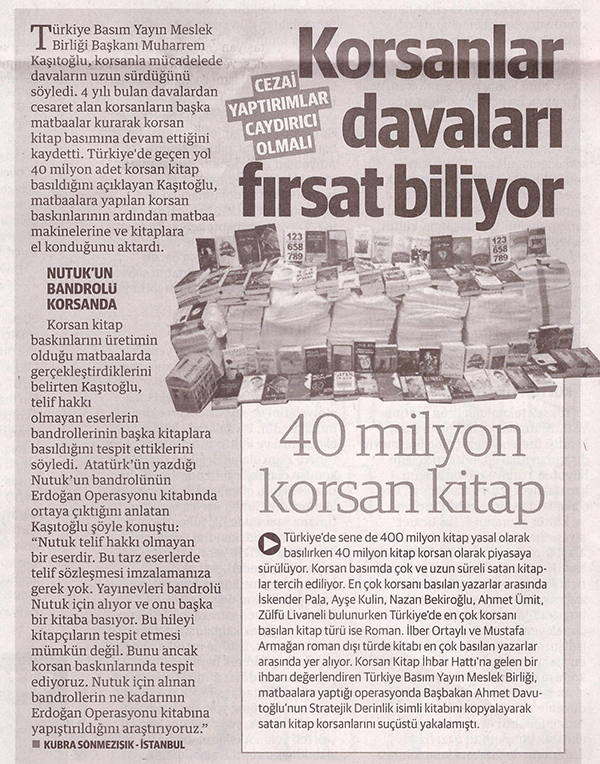 Bu arada, Korsan Kitap Hattı’na ihbarda bulunmak için korsanihbar@tbym.org adresine mail göndermeniz ya da 0212-5140737 – 0530- 5807799 numaralarını aramanız yeterli.