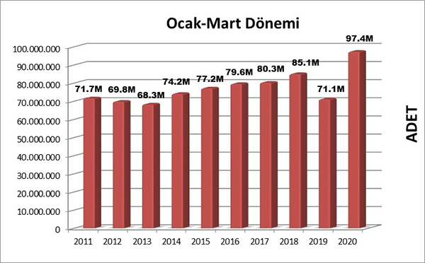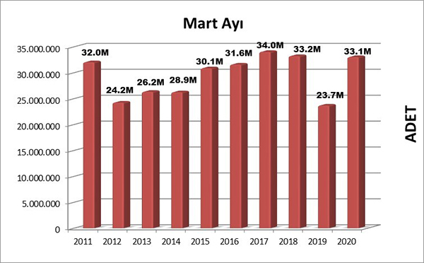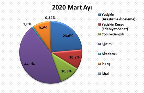 2020 Mart ayında 33.075.479 adet kitap yayımlanmıştır. Geçen yılın aynı ayında yayımlanan kitap sayısı 23.723.511 adet olarak kayıtlara geçmişti. Söz konusu veriler kıyaslandığında bir önceki yıla göre bu yıl yaklaşık %39 oranında büyüme gerçekleştiği ortaya çıkmaktadır. Değerlendirme yapılırken geçen yılın ilk yarısının ekonomik kriz sebebiyle üretimin düşük kaldığı bir dönem olduğu gerçeği göz ardı edilmemelidir.