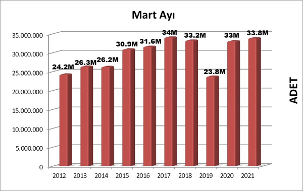 2020 yılının mart ayındaki bu rakam 33.075.479 olarak kayıtlara geçmişti. Geçen yıla oranla %2.4 oranında bir artış görülmektedir. Kitap üretiminde yılın ilk iki ayında önceki yıla oranla çok ciddi düşüşler yaşanmıştır. Mart ayı ile birlikte ise düşük düzeyde de olsa bir artış gözlemlenmiştir.
