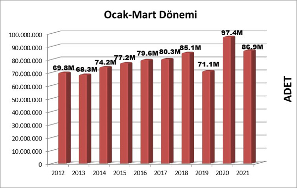 Mart ayı ile yılın ilk çeyreğini tamamlamış olduk. 2020 yılının ilk çeyreğinde yayımlanan toplam kitap sayısı 97.451.137 adet olarak gerçekleşmişti. Bu yılın ilk çeyreğinde ise yayımlanan kitap sayısı 86.988.411 adettir. Bu rakamlara göre ilk çeyreğinde %10.7 oranında bir küçülme gerçekleşmiştir.